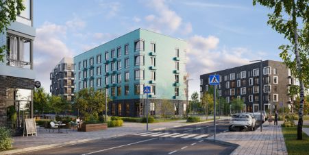 Жилой комплекс в окружении лесопарков и рядом с рекой. До станции МЦД-4 "Санино" можно дойти пешком за 7 минут, а на территории проекта появится транспортно-пересадочный узел с торговым центром. Для жителей построят школу, 2 детсада, в одном из которых будут развивающие кабинеты-трансформеры.
