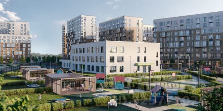 Жилой комплекс в окружении лесопарков и рядом с рекой. До станции МЦД-4 "Санино" можно дойти пешком за 7 минут, а на территории проекта появится транспортно-пересадочный узел с торговым центром. Для жителей построят школу, 2 детсада, в одном из которых будут развивающие кабинеты-трансформеры.
