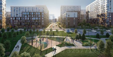 Жилой комплекс в окружении лесопарков и рядом с рекой. До станции МЦД-4 "Санино" можно дойти пешком за 7 минут, а на территории проекта появится транспортно-пересадочный узел с торговым центром. Для жителей построят школу, 2 детсада, в одном из которых будут развивающие кабинеты-трансформеры.