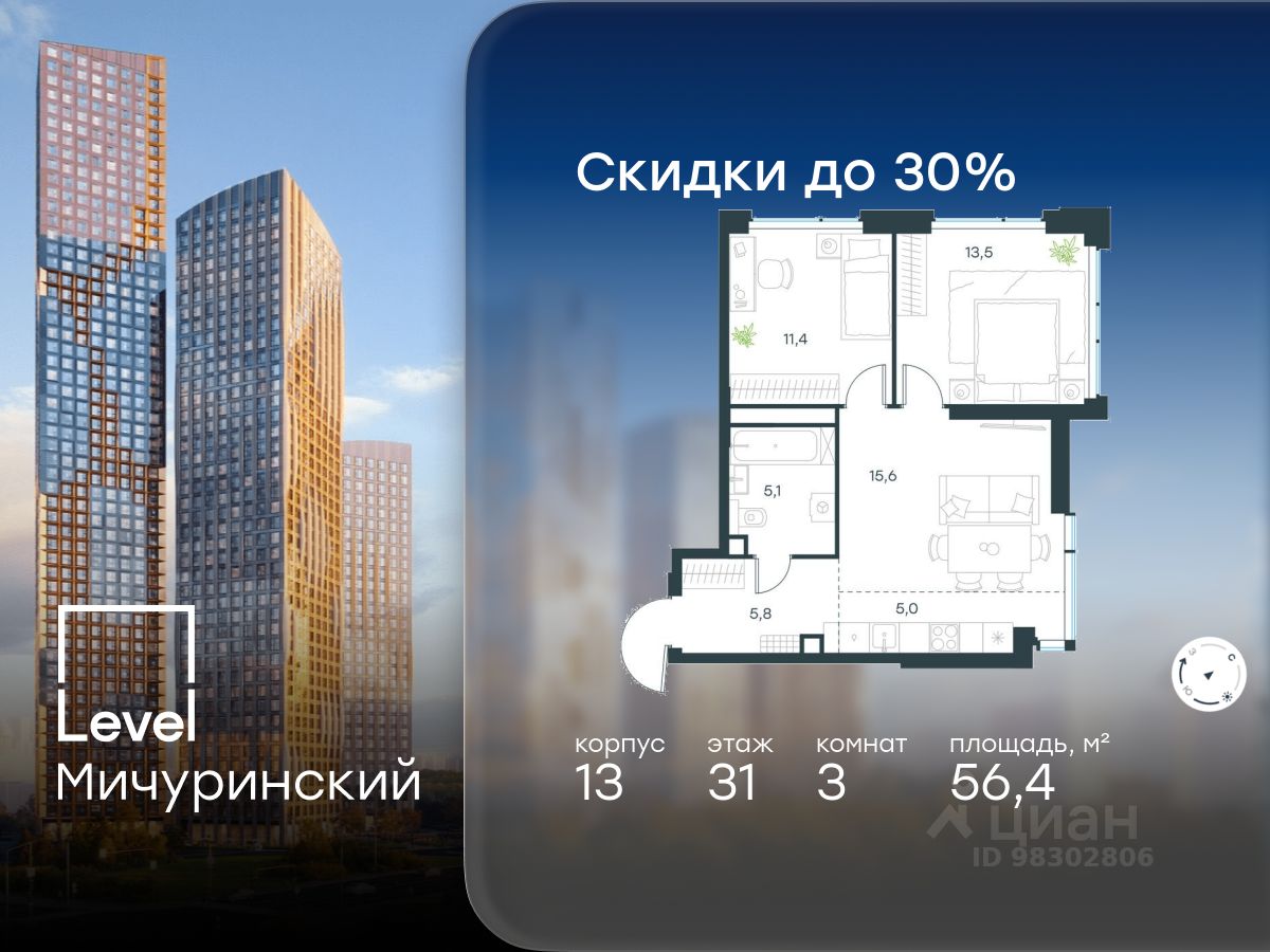В жилом квартале, расположенном на границе с природным заказником "Долина реки Очаковки", продаётся 3-комнатная квартира площадью 56.40 кв.м без отделки. Квартира расположена на 31 этаже 31-этажного корпуса 13 в жилом комплексе бизнес-класса Level Мичуринский (компания Level Group/Левел групп).