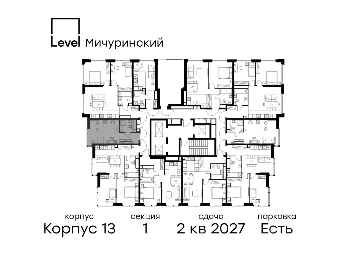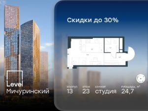 В жилом квартале, расположенном на границе с природным заказником "Долина реки Очаковки", продаётся студия площадью 24.70 кв.м без отделки. Квартира расположена на 23 этаже 31-этажного корпуса 13 в жилом комплексе бизнес-класса Level Мичуринский (компания Level Group/Левел групп).