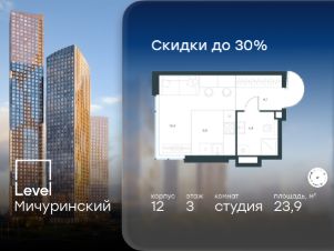 В жилом квартале, расположенном на границе с природным заказником "Долина реки Очаковки", продаётся студия площадью 23.90 кв.м без отделки. Квартира расположена на 3 этаже 11-этажного корпуса 12 в жилом комплексе бизнес-класса Level Мичуринский (компания Level Group/Левел групп).