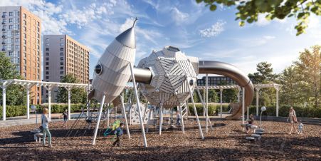 Дворы-парки закрыты от машин и посторонних. На территории — прогулочный маршрут вдоль реки Незнайка и набережная с шезлонгами и качелями для отдыха. Также здесь появится плейхаб "Незнайка на Луне", площадь для мероприятий с сухим фонтаном, летним кинотеатром и кафе.