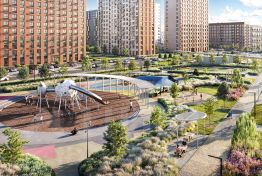 Дворы-парки закрыты от машин и посторонних. На территории — прогулочный маршрут вдоль реки Незнайка и набережная с шезлонгами и качелями для отдыха. Также здесь появится плейхаб "Незнайка на Луне", площадь для мероприятий с сухим фонтаном, летним кинотеатром и кафе.
