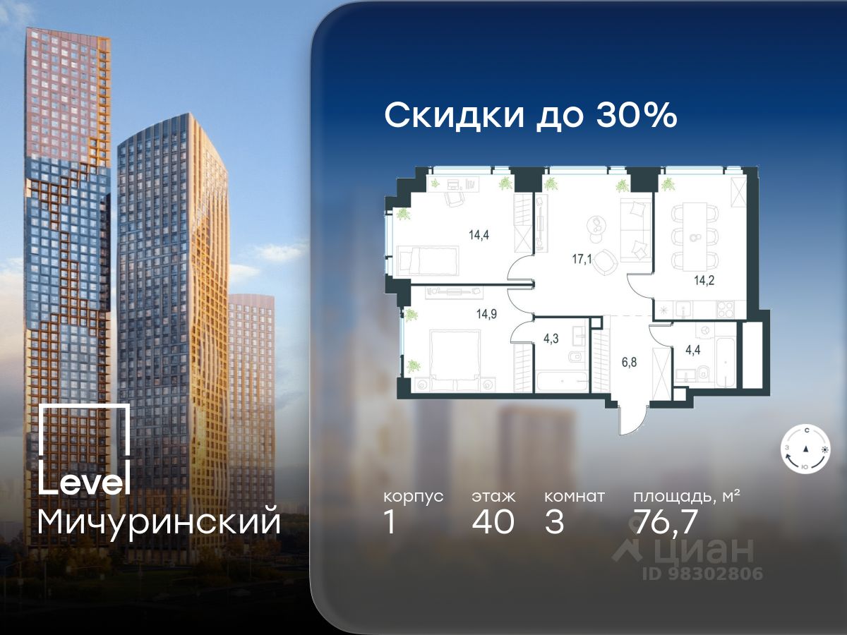 В жилом квартале, расположенном на границе с природным заказником "Долина реки Очаковки", продаётся 3-комнатная квартира площадью 76.70 кв.м без отделки. Квартира расположена на 40 этаже 54-этажного корпуса 1 в жилом комплексе бизнес-класса Level Мичуринский (компания Level Group/Левел групп).