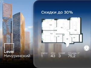 В жилом квартале, расположенном на границе с природным заказником "Долина реки Очаковки", продаётся 3-комнатная квартира площадью 75.20 кв.м без отделки. Квартира расположена на 43 этаже 54-этажного корпуса 1 в жилом комплексе бизнес-класса Level Мичуринский (компания Level Group/Левел групп).