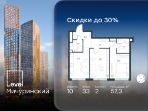 В жилом квартале, расположенном на границе с природным заказником "Долина реки Очаковки", продаётся 2-комнатная квартира площадью 57.30 кв.м с отделкой white box. Квартира расположена на 33 этаже 42-этажного корпуса 10 в жилом комплексе бизнес-класса Level Мичуринский (компания Level Group/Левел групп).