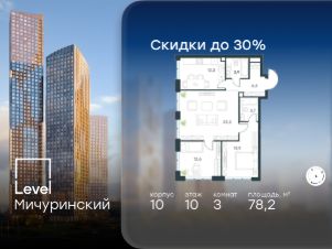 В жилом квартале, расположенном на границе с природным заказником "Долина реки Очаковки", продаётся 3-комнатная квартира площадью 78.20 кв.м с отделкой white box. Квартира расположена на 10 этаже 42-этажного корпуса 10 в жилом комплексе бизнес-класса Level Мичуринский (компания Level Group/Левел групп).