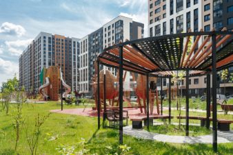Во дворах-парках, закрытых от машин, комфортно и безопасно гулять. Здесь высажены уже взрослые деревья, которые создают прохладную тень в жаркий день.
