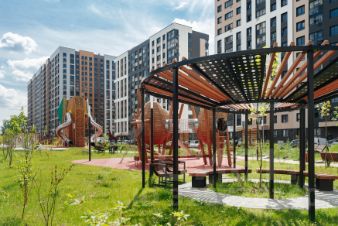 Во дворах-парках, закрытых от машин, комфортно и безопасно гулять. Здесь высажены уже взрослые деревья, которые создают прохладную тень в жаркий день.