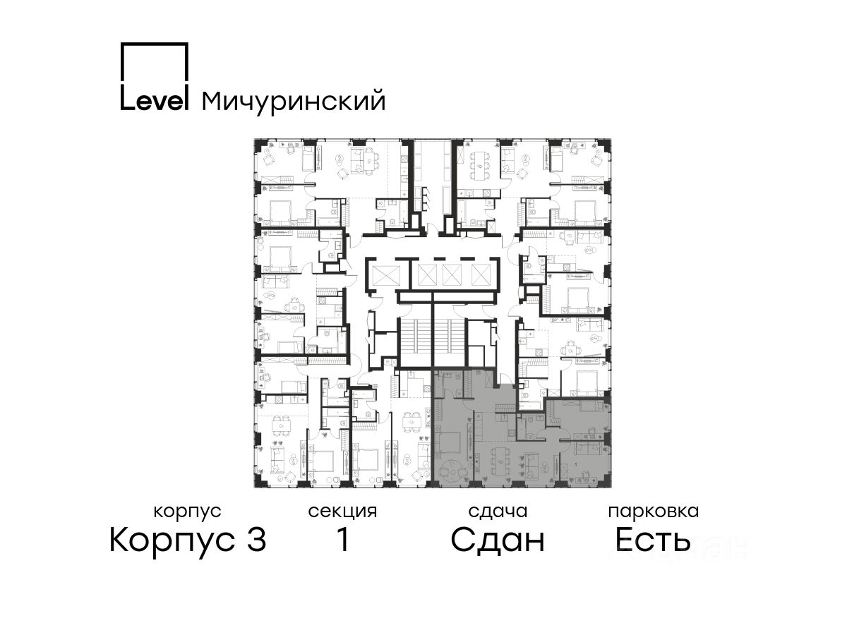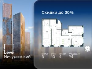 В жилом квартале, расположенном на границе с природным заказником "Долина реки Очаковки", продаётся 4-комнатная квартира площадью 94.00 кв.м с отделкой white box. Квартира расположена на 10 этаже 30-этажного корпуса 3 в жилом комплексе бизнес-класса Level Мичуринский (компания Level Group/Левел групп).