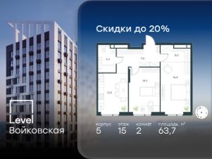Продается 2-комнатная квартира площадью 63.70 кв. м без отделки. Квартира находится на 15 этаже 20-этажного корпуса 5, в новом жилом комплексе бизнес-класса Level Войковская, расположенном рядом с живописным заповедником "Покровское-Стрешнево" (застройщик - компания Level Group/Левел групп).