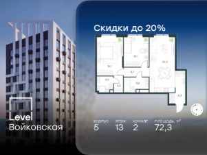 Продается 2-комнатная квартира площадью 72.30 кв. м без отделки. Квартира находится на 13 этаже 20-этажного корпуса 5, в новом жилом комплексе бизнес-класса Level Войковская, расположенном рядом с живописным заповедником "Покровское-Стрешнево" (застройщик - компания Level Group/Левел групп).