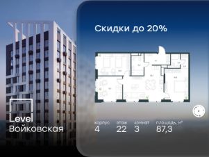 Продается 3-комнатная квартира площадью 87.30 кв. м с отделкой. Квартира находится на 22 этаже 26-этажного корпуса 4, в новом жилом комплексе бизнес-класса Level Войковская, расположенном рядом с живописным заповедником "Покровское-Стрешнево" (застройщик - компания Level Group/Левел групп).