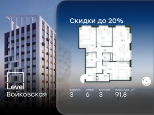 Продается 3-комнатная квартира площадью 91.80 кв. м без отделки. Квартира находится на 6 этаже 20-этажного корпуса 3, в новом жилом комплексе бизнес-класса Level Войковская, расположенном рядом с живописным заповедником "Покровское-Стрешнево" (застройщик - компания Level Group/Левел групп).