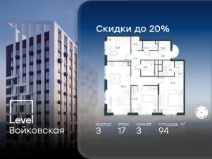 Продается 3-комнатная квартира площадью 94.00 кв. м без отделки. Квартира находится на 17 этаже 20-этажного корпуса 3, в новом жилом комплексе бизнес-класса Level Войковская, расположенном рядом с живописным заповедником "Покровское-Стрешнево" (застройщик - компания Level Group/Левел групп).