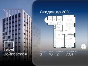 Продается 2-комнатная квартира площадью 70.40 кв. м без отделки. Квартира находится на 10 этаже 20-этажного корпуса 3, в новом жилом комплексе бизнес-класса Level Войковская, расположенном рядом с живописным заповедником "Покровское-Стрешнево" (застройщик - компания Level Group/Левел групп).