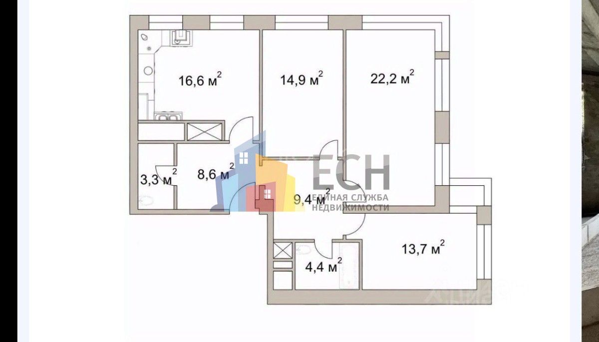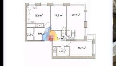 - 3 изолированные комнаты: 22,2 / 14,9 / 13,7 м².