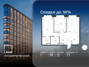 В Академическом районе продаётся 3-комнатная квартира площадью 71.00 кв.м без отделки. Квартира расположена на 19-м этаже 19-этажного жилого комплекса бизнес-класса Level Академическая (компания Level Group).