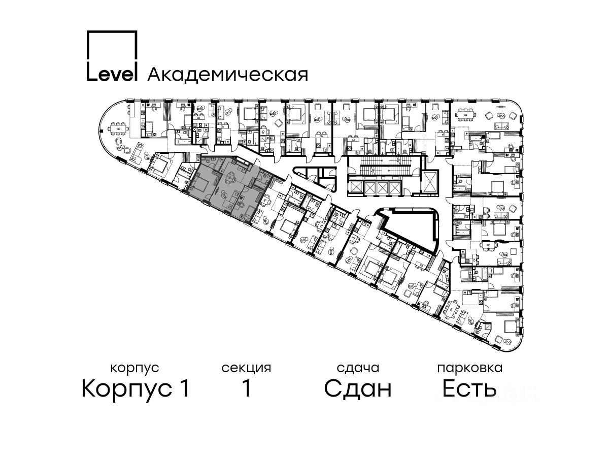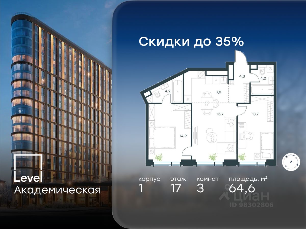 В Академическом районе продаётся 3-комнатная квартира площадью 64.60 кв.м без отделки. Квартира расположена на 17-м этаже 19-этажного жилого комплекса бизнес-класса Level Академическая (компания Level Group).