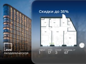 В Академическом районе продаётся 3-комнатная квартира площадью 67.00 кв.м без отделки. Квартира расположена на 17-м этаже 19-этажного жилого комплекса бизнес-класса Level Академическая (компания Level Group).