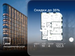 В Академическом районе продаётся 4-комнатная квартира площадью 122.50 кв.м без отделки. Квартира расположена на 19-м этаже 19-этажного жилого комплекса бизнес-класса Level Академическая (компания Level Group).