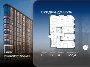 В Академическом районе продаётся 4-комнатная квартира площадью 122.40 кв.м без отделки. Квартира расположена на 17-м этаже 19-этажного жилого комплекса бизнес-класса Level Академическая (компания Level Group).