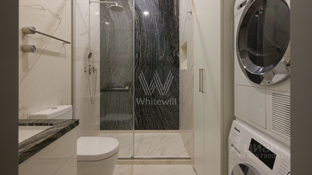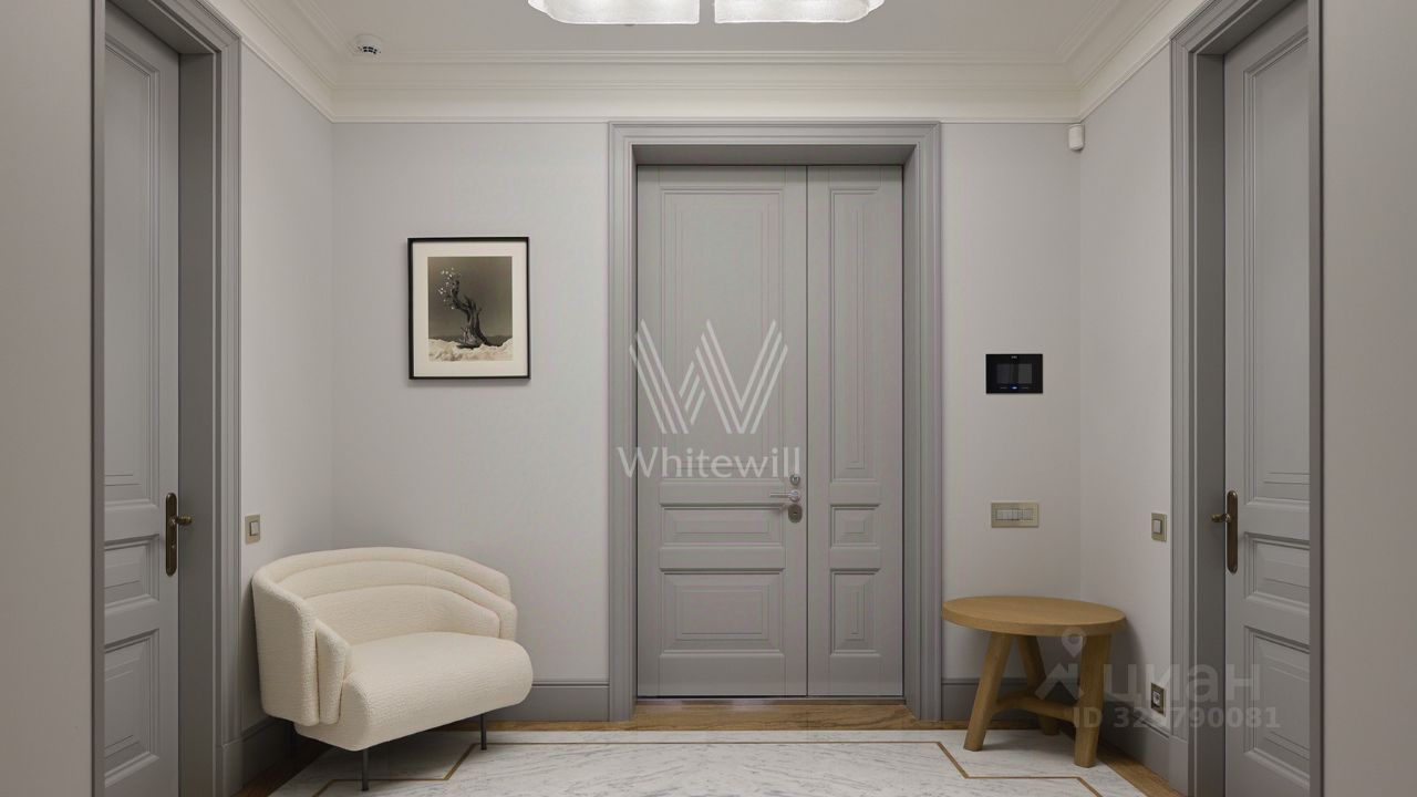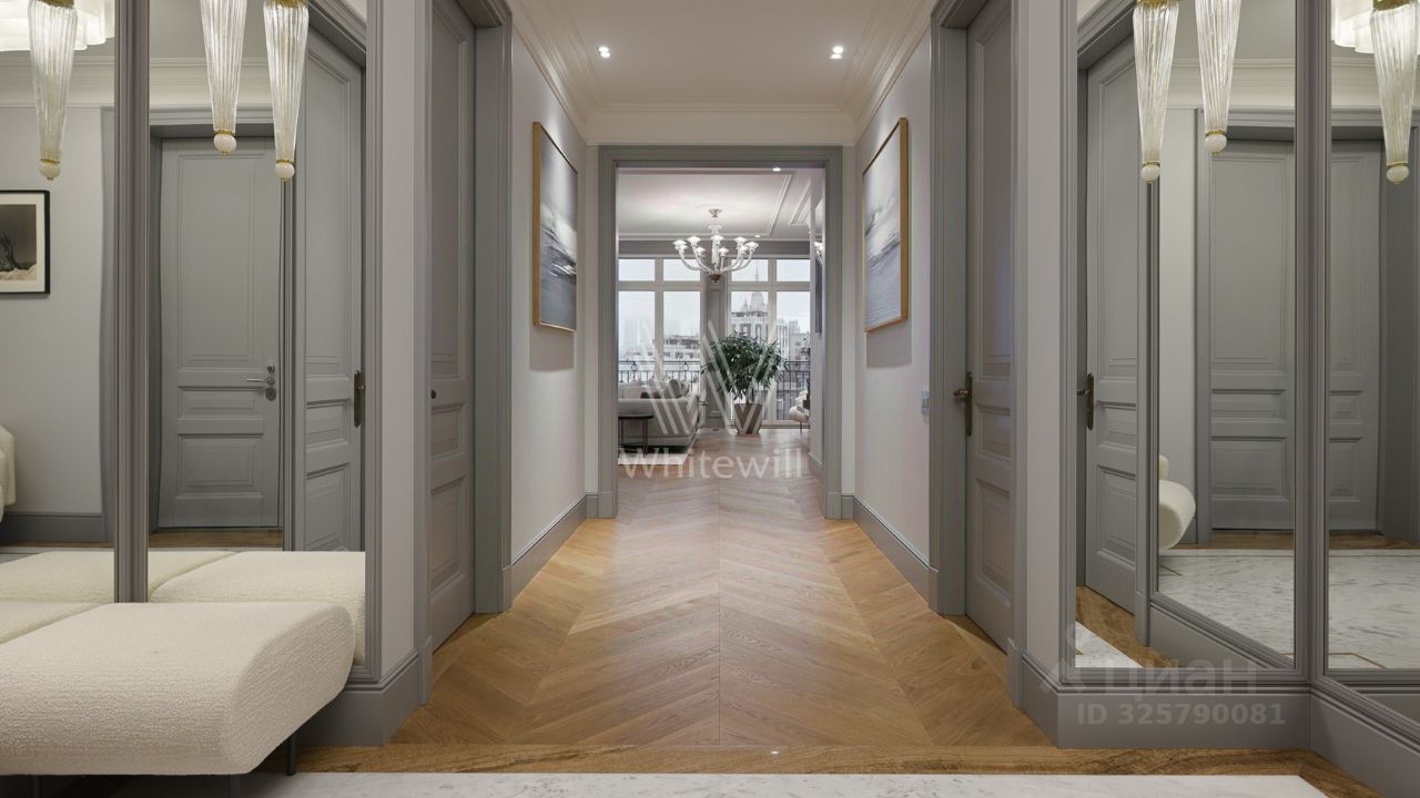 Планировка включает гостиную, отдельную кухню, мастер-спальню с гардеробной и ванной комнатой с окном, 2 изолированные спальни, 2 гардеробные, 2 санузла, постирочную-душевую и холл. Высота потолков — 3,4 метра. На этаже всего 2 квартиры, что обеспечивает приватность и тишину. Дополнительно можно приобрести 2 машино-места.