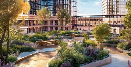 Открытый променад - сквозной маршрут на крыше стилобата с зонами отдыха, занятий спортом, детских игр и совместной работы. Все площадки плавно связаны между собой прогулочной дорожкой.