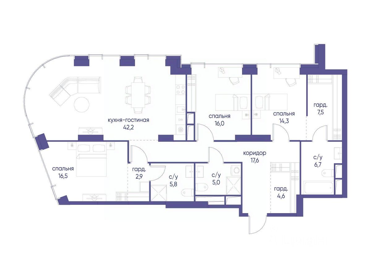 В престижном районе Пресня, на перекрестке делового и исторического центров Москвы, продается трехкомнатная квартира площадью 139.10 кв. м без отделки. Квартира находится на 22 этаже 48-этажного дома, в новом элитном жилом комплексе "Начало" от девелопера "Донстрой". Реализация проекта запланирована на 1 квартал 2030 года.