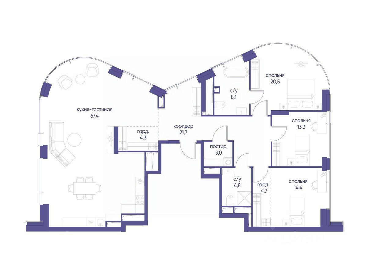 В престижном районе Пресня, на перекрестке делового и исторического центров Москвы, продается трехкомнатная квартира площадью 162.30 кв. м без отделки. Квартира находится на 45 этаже 48-этажного дома, в новом элитном жилом комплексе "Начало" от девелопера "Донстрой". Реализация проекта запланирована на 1 квартал 2030 года.