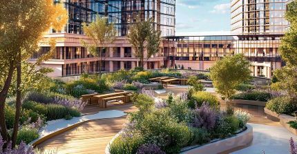 Открытый променад - сквозной маршрут на крыше стилобата с зонами отдыха, занятий спортом, детских игр и совместной работы. Все площадки плавно связаны между собой прогулочной дорожкой.