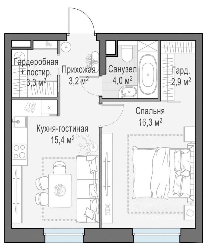 * Кухня-гостиная, спальня, гардеробная, сан.узел.
