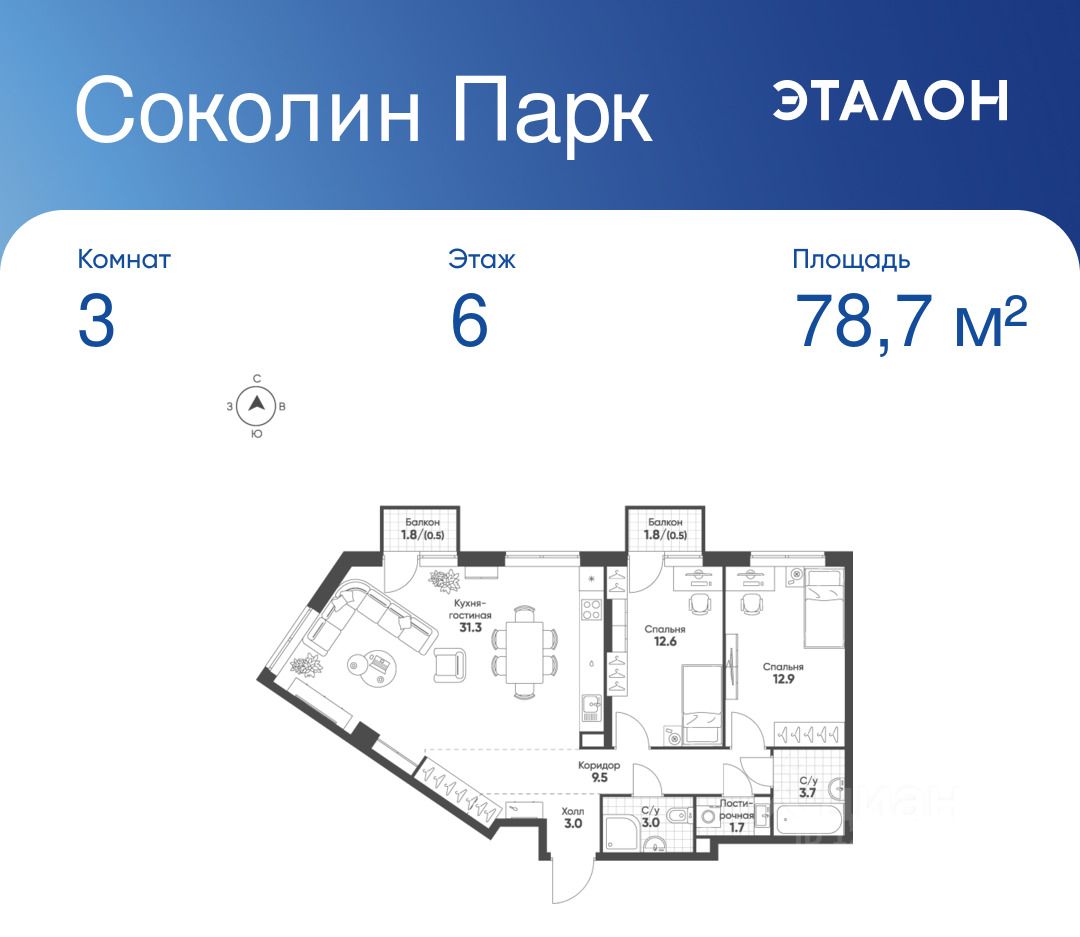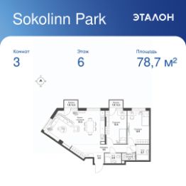 Общая площадь квартиры — 78.7 кв. м, этаж 6 из 12.