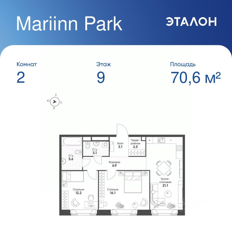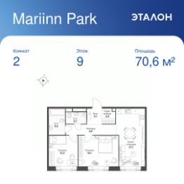 Общая площадь квартиры — 70.6 кв. м, этаж 9 из 16.