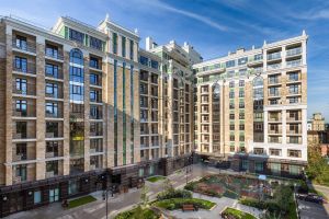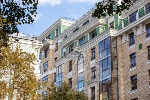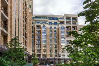 Фасад жилого комплекса "GRAND DELUX на Плющихе" отделан природным камнем. Основание дома оформлено плитами натурального гранита и массивными архитектурными элементами из камня.
