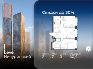 В жилом квартале, расположенном на границе с природным заказником "Долина реки Очаковки", продаётся 3-комнатная квартира площадью 60.40 кв.м без отделки. Квартира расположена на 7 этаже 42-этажного корпуса 2 в жилом комплексе бизнес-класса Level Мичуринский (компания Level Group/Левел групп).