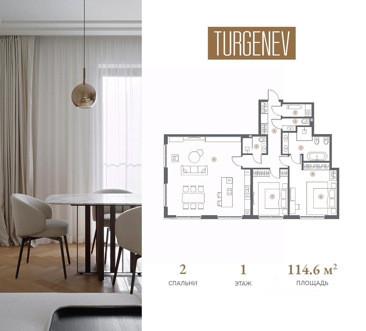 Все квартиры в Клубном доме TURGENEV реализуются с чистовой премиальной дизайнерской отделкой в современном стиле контемпорари от нидерландского бюро Wolterinck. В отделке квартир в TURGENEV используются экологичные, природные материалы премиального качества: пол из натуральной австрийской паркетной доски Austriawood, стены - итальянская краска PRATTA Exclusive, в санузлах - английская штукатурка Tadelakt и натуральный мрамор: итальянский Wooden White и греческий Pirgon.