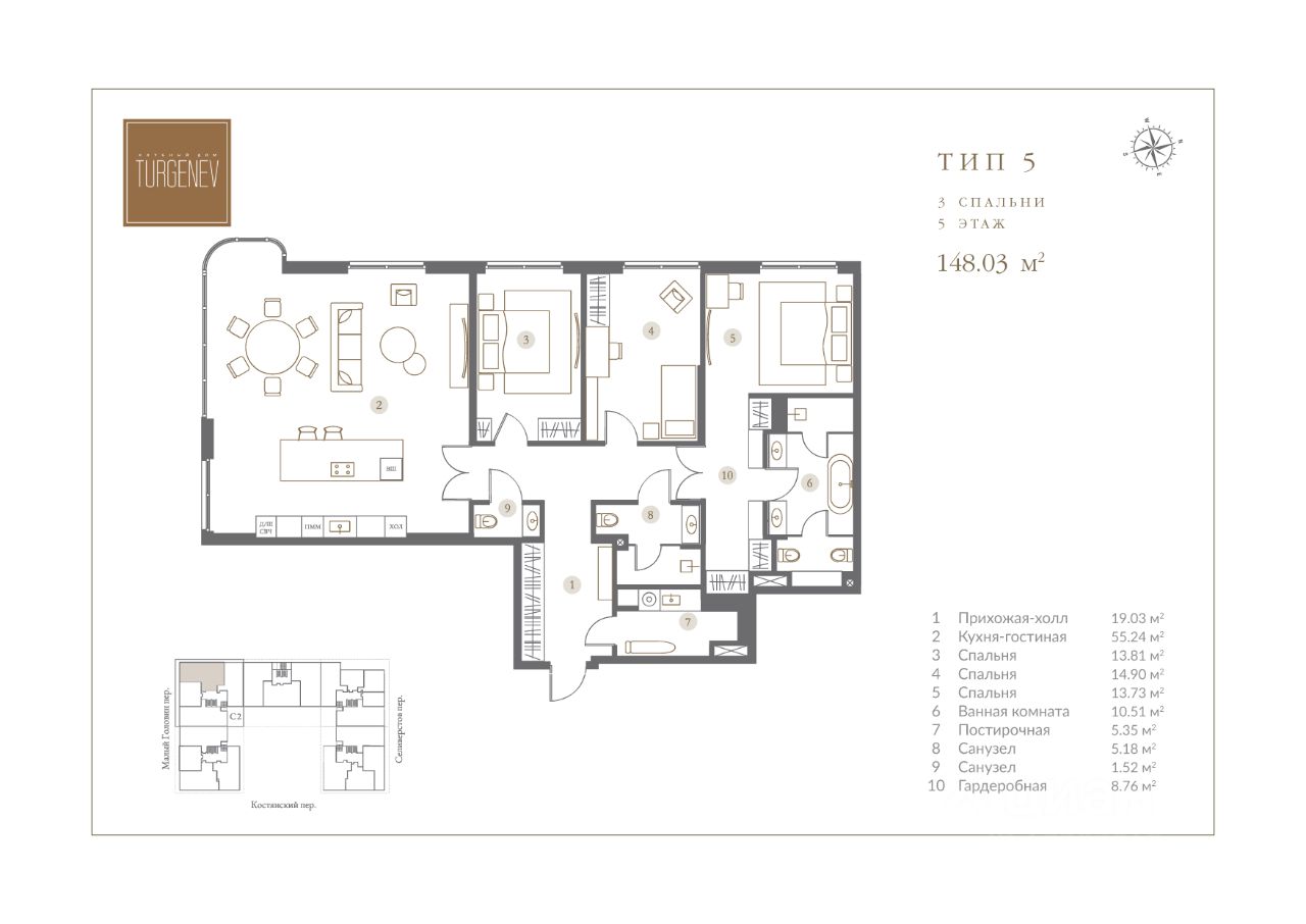 Продаётся трёхспальная квартира с премиальной финишной отделкой на 5 этаже клубного дома TURGENEV.