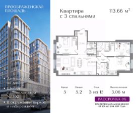 Квартира на 3 этаже в жилом комплексе премиум-класса "Преображенская площадь". Общая площадь: 113.66 кв.м.