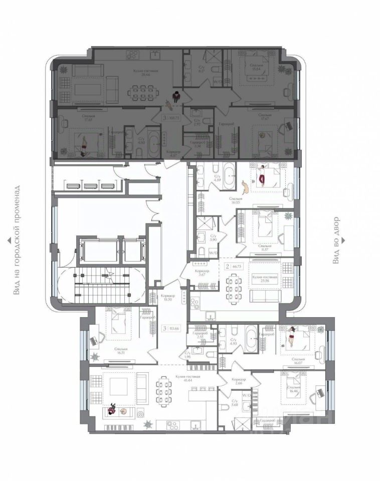 Внутренний двор 1,5 га функциональное и безопасное пространство для игр, работы и занятий спортом. Пешеходный променад для прогулок. Дома переменной этажности. Есть подземный паркинг.