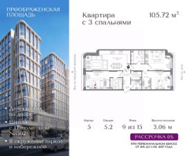 Квартира на 9 этаже в жилом комплексе премиум-класса "Преображенская площадь". Общая площадь: 105.72 кв.м.