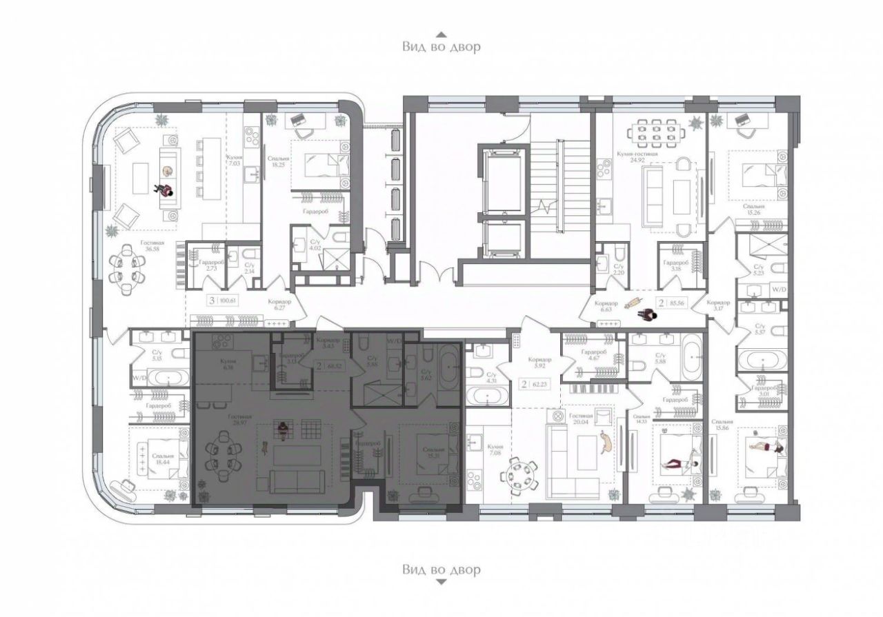 Внутренний двор 1,5 га функциональное и безопасное пространство для игр, работы и занятий спортом. Пешеходный променад для прогулок. Дома переменной этажности. Есть подземный паркинг.