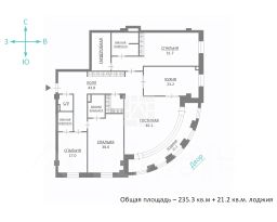 Возможно спланировать: кухня, гостиная с полукруглой лоджией (21.2 кв.м.), 3 изолированные спальни, гардеробные, 3 совмещенных санузла, гостевой санузел, просторный холл.