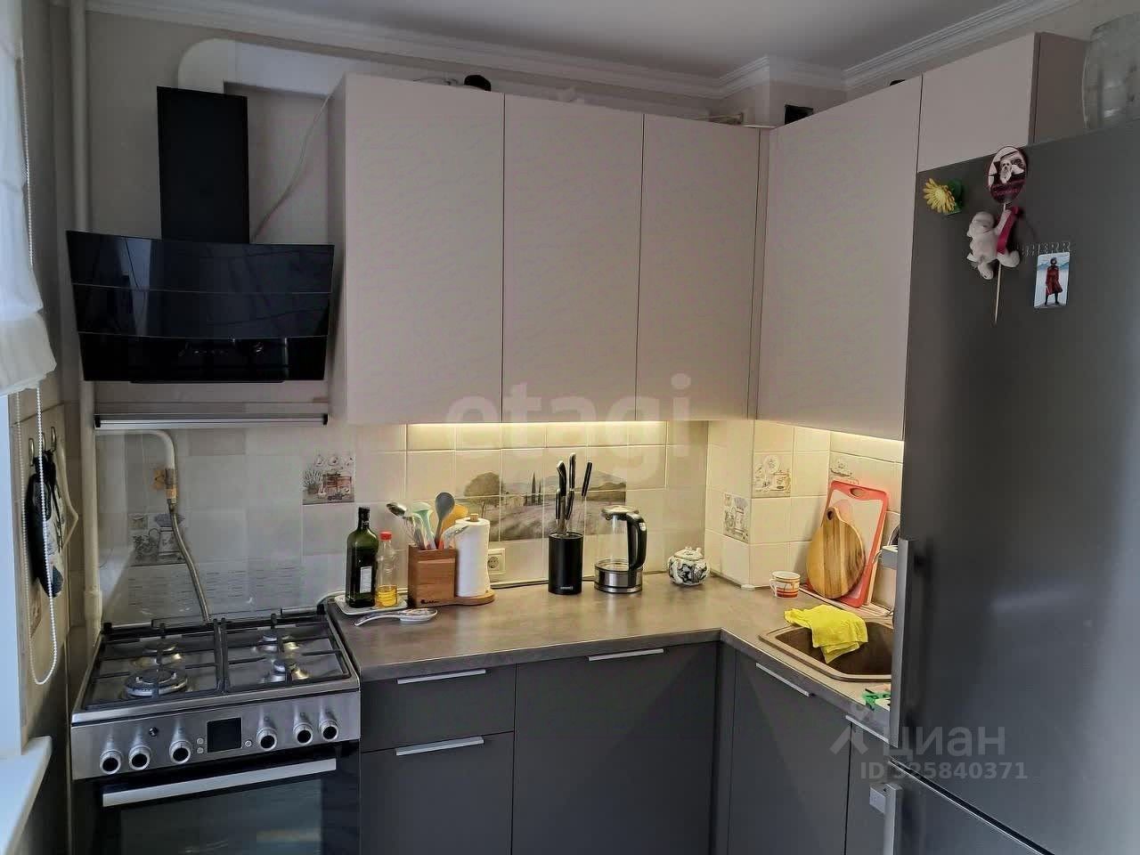 Квартира укомплектована мебелью и техникой, которые остаются в квартире. Кухня: кухонный гарнитур, плита с духовкой, вытяжка, холодильник, обеденный стол и стулья.