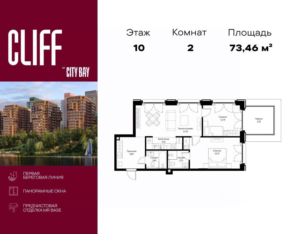 Продаётся 2-комнатная квартира общей площадью 73.46 м² с предчистовой отделкой в ЖК City Вау, квартале Cliff, на 10-м этаже 15 этажного дома.