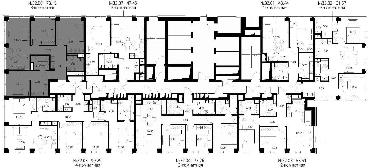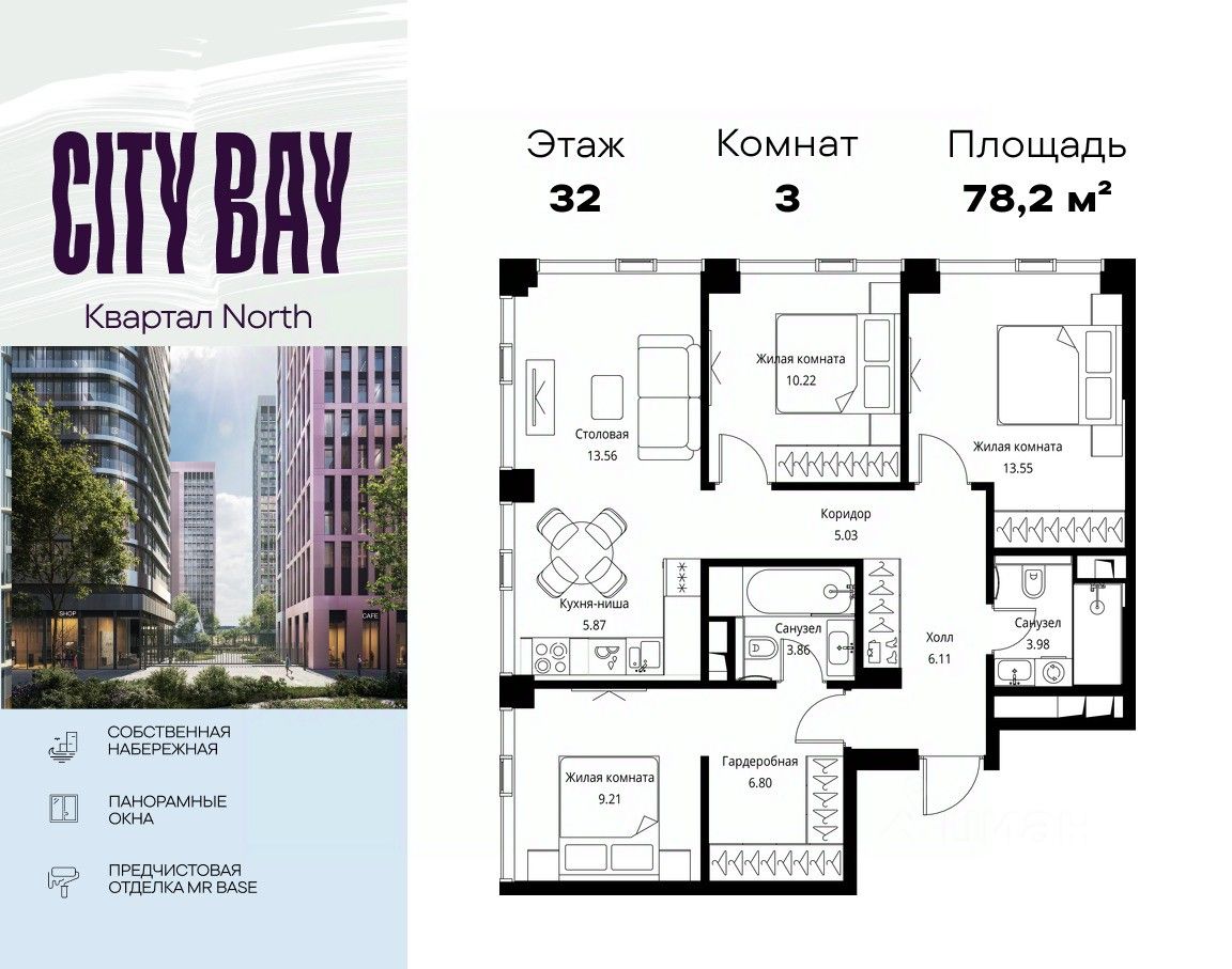Продаётся 3-комнатная квартира общей площадью 78.19 м² с предчистовой отделкой в ЖК City Вау, квартале North, на 32-м этаже 48 этажного дома.