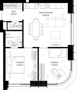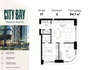 Продаётся 2-комнатная квартира общей площадью 54.10 м² с предчистовой отделкой в ЖК City Вау на 17-м этаже 53 этажного дома.