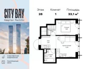 Продаётся 1-комнатная квартира общей площадью 33.10 м² без отделки в ЖК City Вау, квартале Pacific, на 28-м этаже 59 этажного дома.