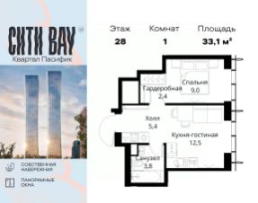 Продаётся 1-комнатная квартира общей площадью 33.10 м² без отделки в ЖК Сити Бэй, квартале Пасифик, на 28-м этаже 59 этажного дома.
